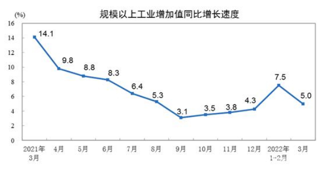 2022年(nián)3月(yuè)份規模以上(shàng)工(gōng)業(yè)增加值增長(cháng)5→%,其中工(gōng)業(yè)機(jī)器(qì)人(rén)增長(cháng)16.6%